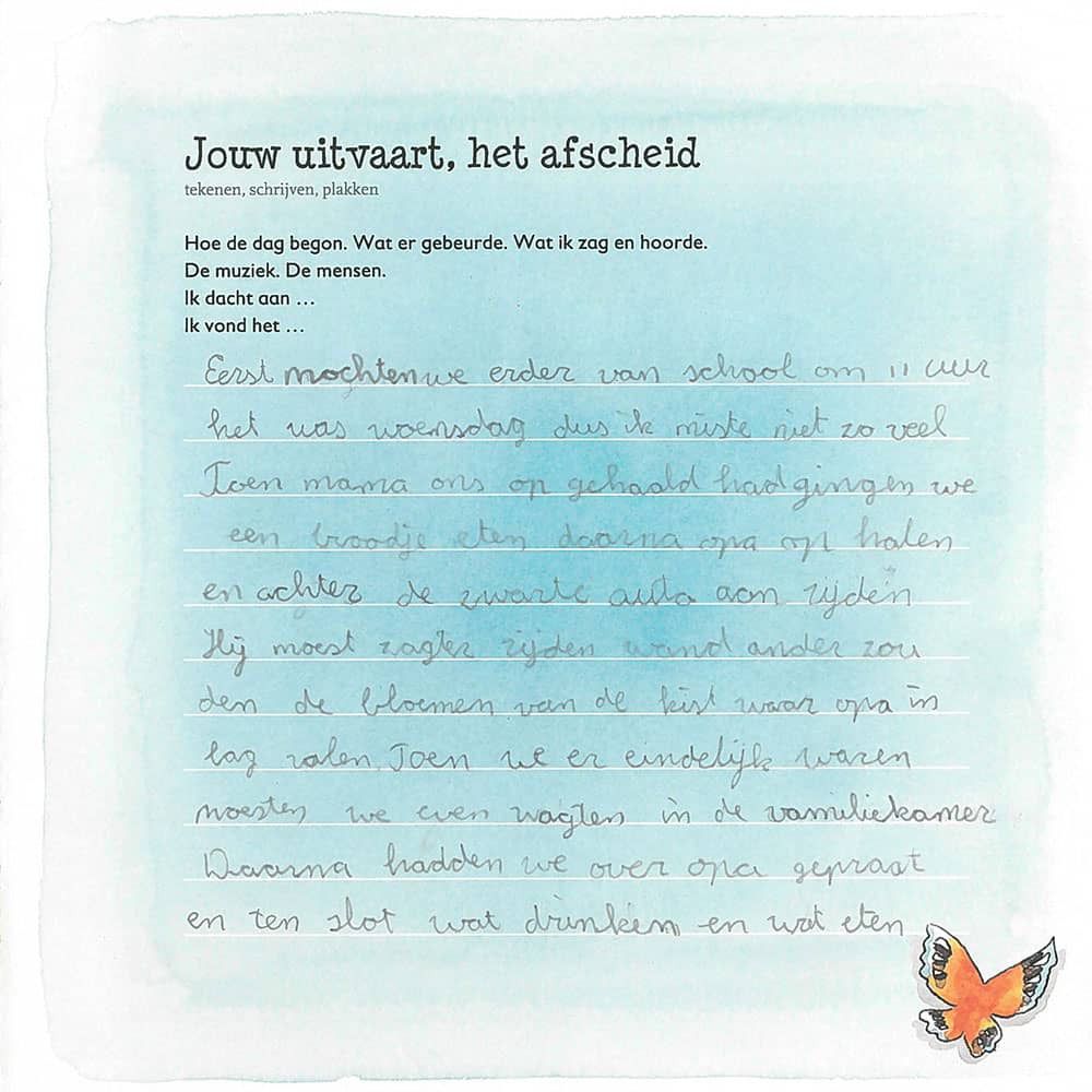 In een werkboekje kunnen kinderen al schrijvend en tekenend hun gedachten en gevoelens uiten. Ongemerkt ontstaat zo tevens een mooie, tastbare herinnering aan de overleden persoon.